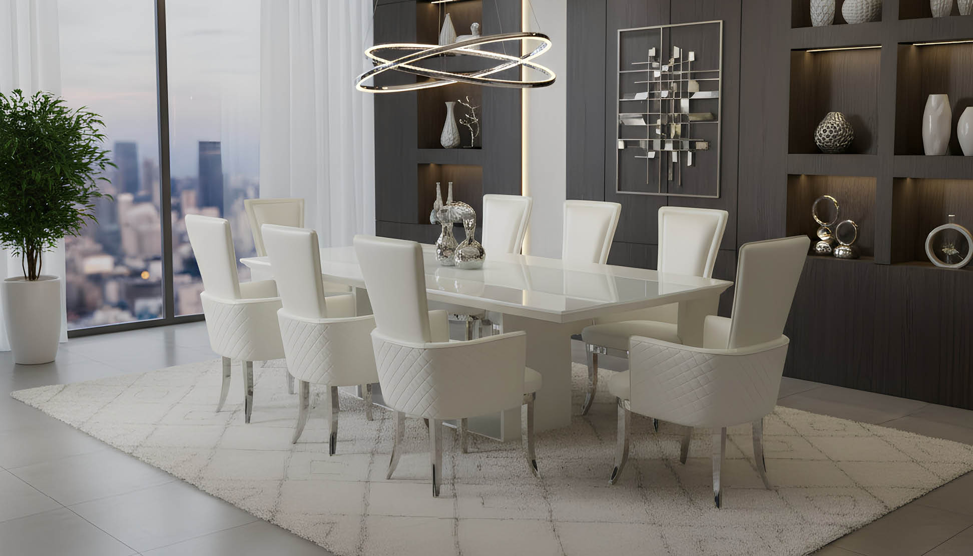 The set is completed with eight luxury white dining chairs, beautifully designed with chrome legs that add a contemporary edge while offering comfort and support. An optional matching server is also available, providing stylish storage and the perfect finishing touch to create a cohesive, polished look.